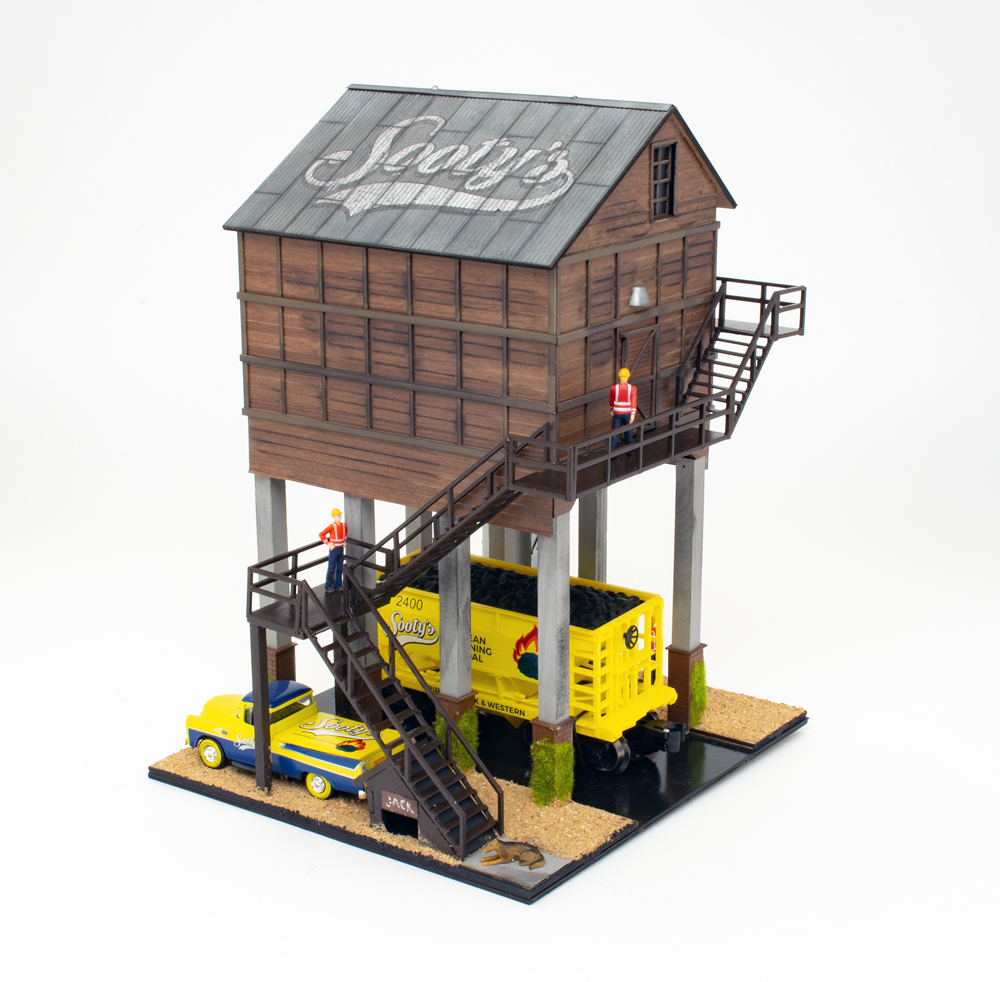 Sooty’s includes both a licensed 1957 Dodge truck (with Sooty’s logo) and an exclusive Sooty’s coal car. The truck is glued in place. The coal car is removable via two pieces of wire tied to the underside of the structure base. You could remove the car and add a section of track so it runs under the tipple.