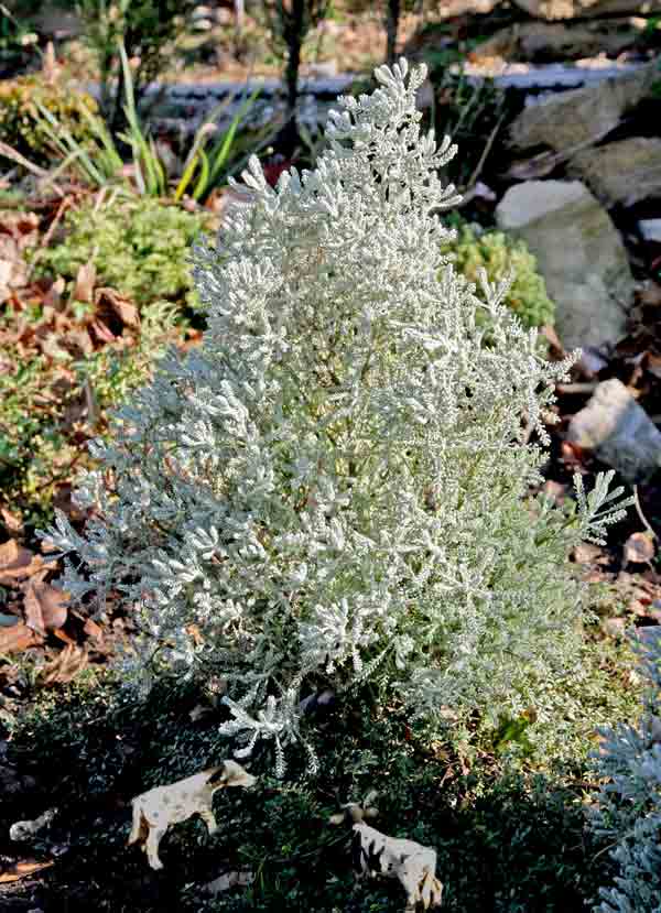 Dwarf gray lavender cotton (Santolina chamaecyparissus ‘Nana’, Zones 5-9) will lend a touch of soft texture to the wooded landscape (photo 8). At maturity it will reach 18″ high and, with light pruning, can pass for an interestingly textured tree. Lavender cotton requires full sun and a well-drained soil amended with sand or gravel, and is drought tolerant.