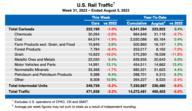 Through 31 weeks of 2023, U.S. carload traffic is up 0.4% while intermodal traffic is off by 9.5% for an overall decline of 5%.