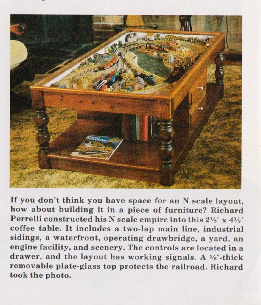 By the age of seven I promised myself that one day my model railroad would be on those pages. When I left home and became a dad myself, I built an N scale layout inside a coffee table where it would be safe from little fingers and the household cats. My young children, and those of our neighbors, loved running the little trains under glass. Those trains are still running today, but now with my grandchildren at the throttle.