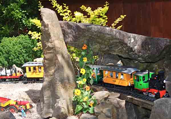 My prior experience of regularly running trains on a mostly elevated railroad influenced my decision to build elevated track—it makes operating and working on the railroad so much more pleasurable. But I also wanted a garden, to increase the pleasure of being in my own little world. Because of the rather ponderous look of pressure-treated 2 x 8″ roadbed on 4 x 4″ posts set into deck blocks within the garden, I’ve evolved four strategies for integrating the railroad: