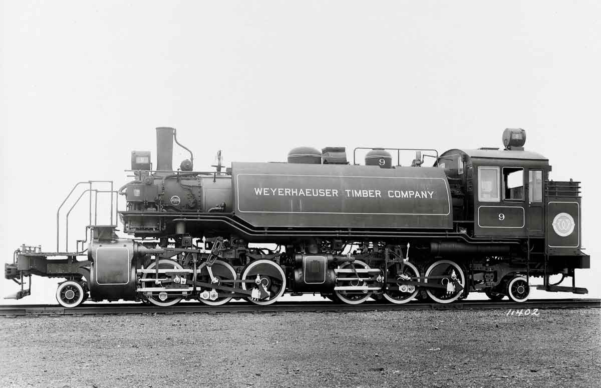 The 2-6-6-2T Mallet, exemplified by Weyerhauser No. 9, was perhaps the ultimate development of the logging locomotive. Compact, powerful, and flexible, the type was ideally suited to pulling heavy loads over rough, sharply curved track. Geared locomotives like the Shay also possessed these traits, but could not make the speed of a rod engine.