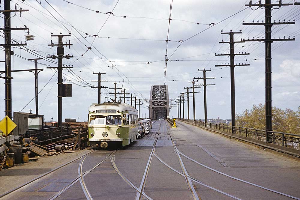 In an early 1950s scene looking west, Granite City-bound PCC 457, one of eight, holds for an interurban from Peoria to enter McKinley Bridge. John Humiston, Richard Humiston collection