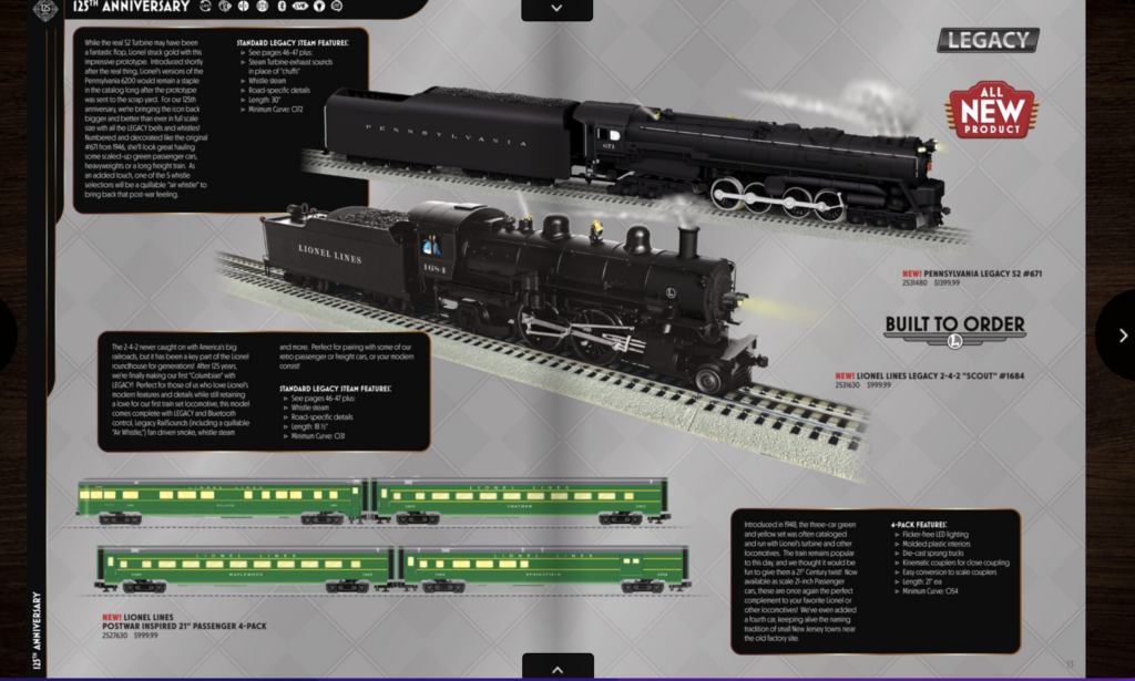 The first announcement of what the brilliant minds at Lionel wanted to accomplish for 2025 appears on pages 12 and 13 of the new catalog. There, we see the brand-new No. 2531630 scale replica of the Pennsy S2 Turbine equipped with Legacy command control and a ton of other extraordinary features and immaculate detail. To get your blood moving fast, the newcomer has as its cab number “671” – this is the engine Lionel’ leaders envisioned for 1946.