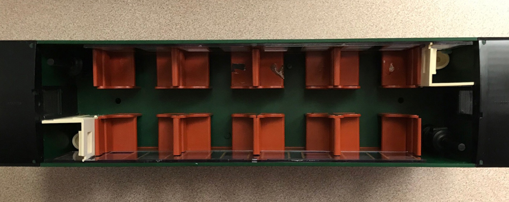 We first needed to remove the interior pieces. The seats, end doors and windows were easily removed, but the toilets, bathroom walls, stoves, and coal boxes were a challenge. The walls and stoves were tall enough to provide enough leverage to pry them out by hand, although with considerable effort. The coal boxes were smaller and were even tougher to get out. The toilets were by far the worst to get out. We had to pry them out with an adjustable wrench. After all items were out, we removed the plastic and epoxy residue with a Dremel tool.