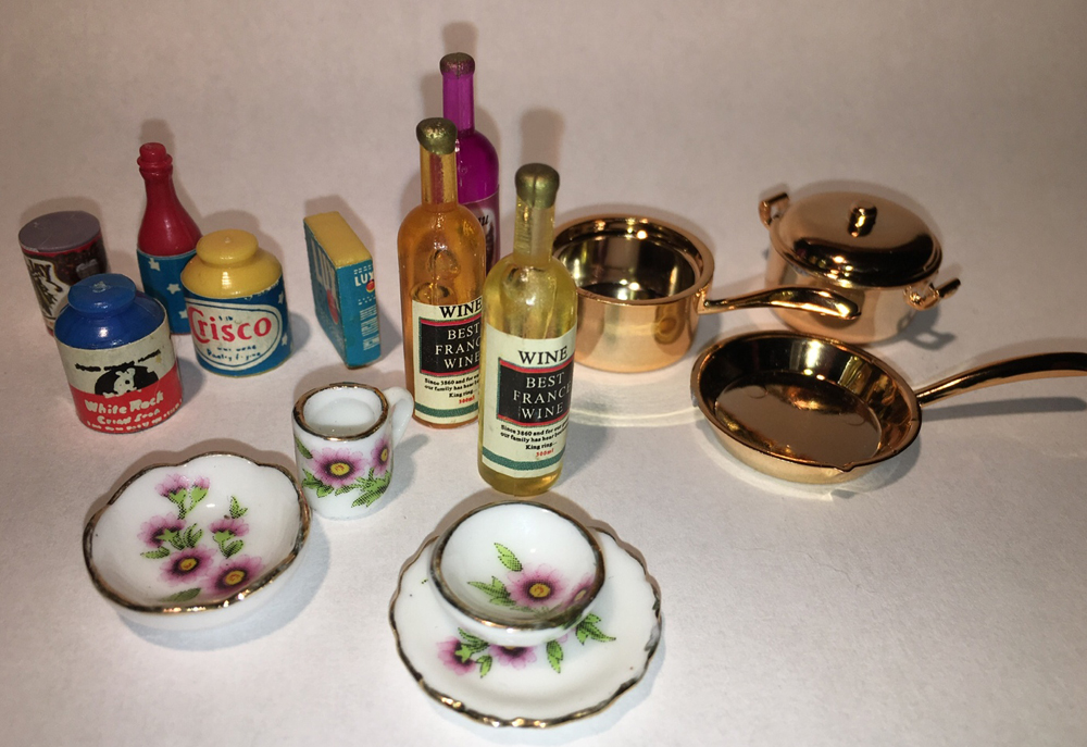 One of the next challenges was finding appropriate cookware, dishware, people, and other details that make models come alive. As LGB’s 1:22.5 is not a common scale, we had to improvise, and as always, internet searches were helpful during our quest. We settled on dollhouse items, commonly in 1:12 scale. By selecting things carefully, we were able to assemble items that while a bit out of proportion, were not egregiously so. For example, we used saucers as dinner plates, and cut what were 375ml wine bottled down to look like 750ml bottles. We also found that by careful placement, we could limit a viewer’s perspective to further hide the scale of the items.