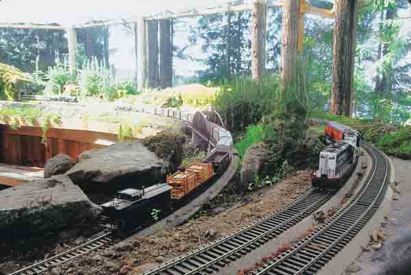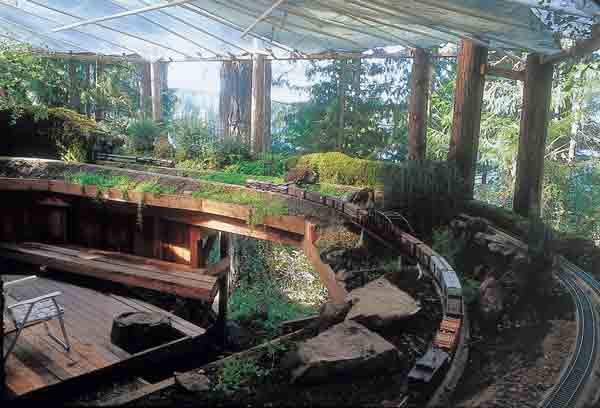 Basic landscaping consisted of adding topsoil to the shelves, then shaping the soil and placing large, mossy rocks (much like building a conventional garden railroad), with emphasis on creating realistic embankments for the elevated sections of roadbed. Roughly 400 conifer seedlings were planted along the “ridges.” The seedlings were obtained from a local reforestation company and consisted mostly of slow-growing Sitka spruce (Picea sitchensis), with lesser quantities of subalpine fir (Abies lasiocarpa) and western hemlock (Tsuga heterophylla).