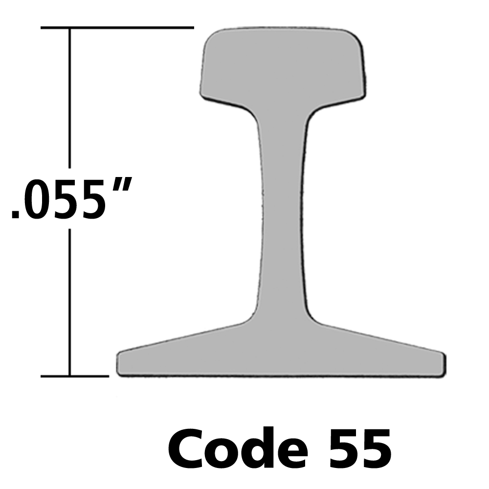 Code 55, at .055 thousandths of an inch tall, has become an accepted middle ground in terms of appearance and operation for N scale track. It’s equivalent to 156 pound rail. Flextrack, sectional track, turnouts, and specialty track (diamonds, etc.) are all offered in code 55 from various manufacturers.