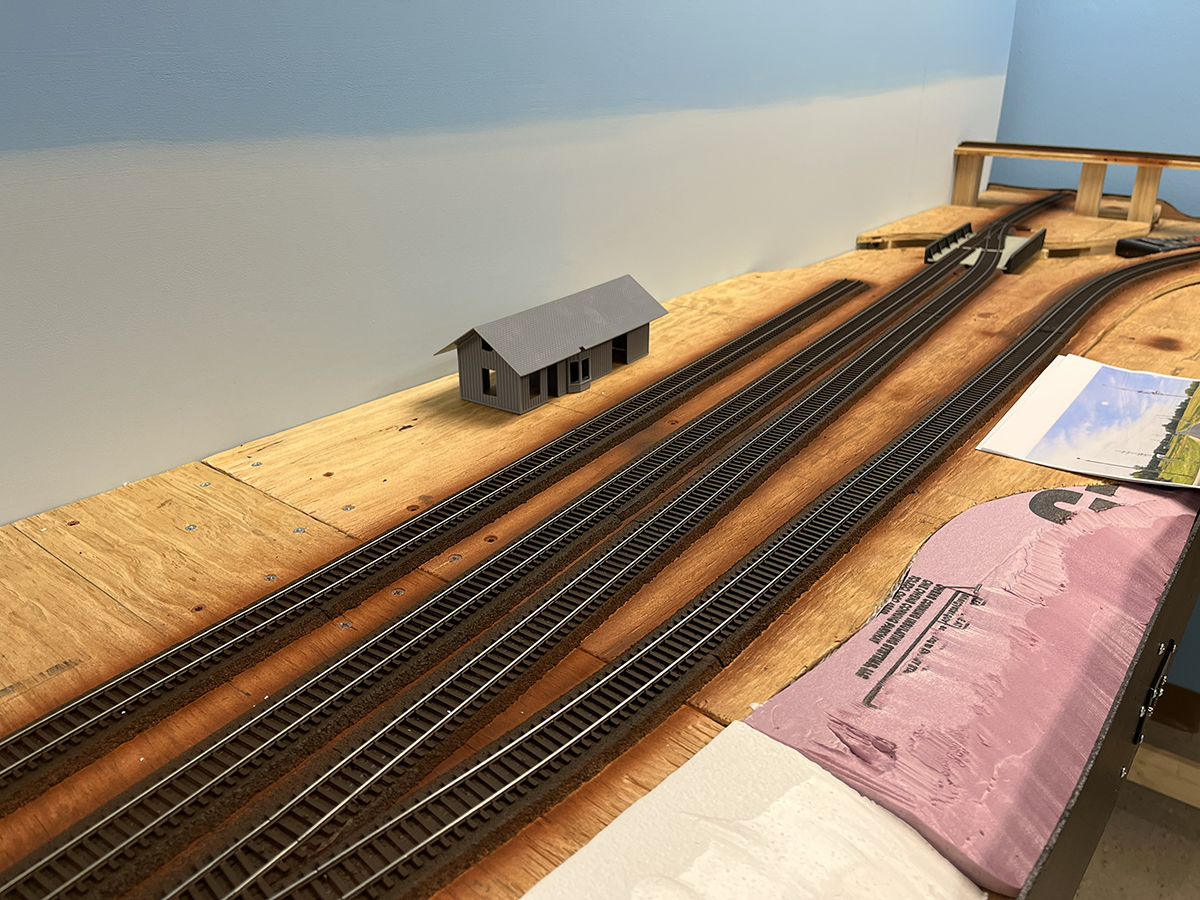 A partially completed model railroad layout with painted track