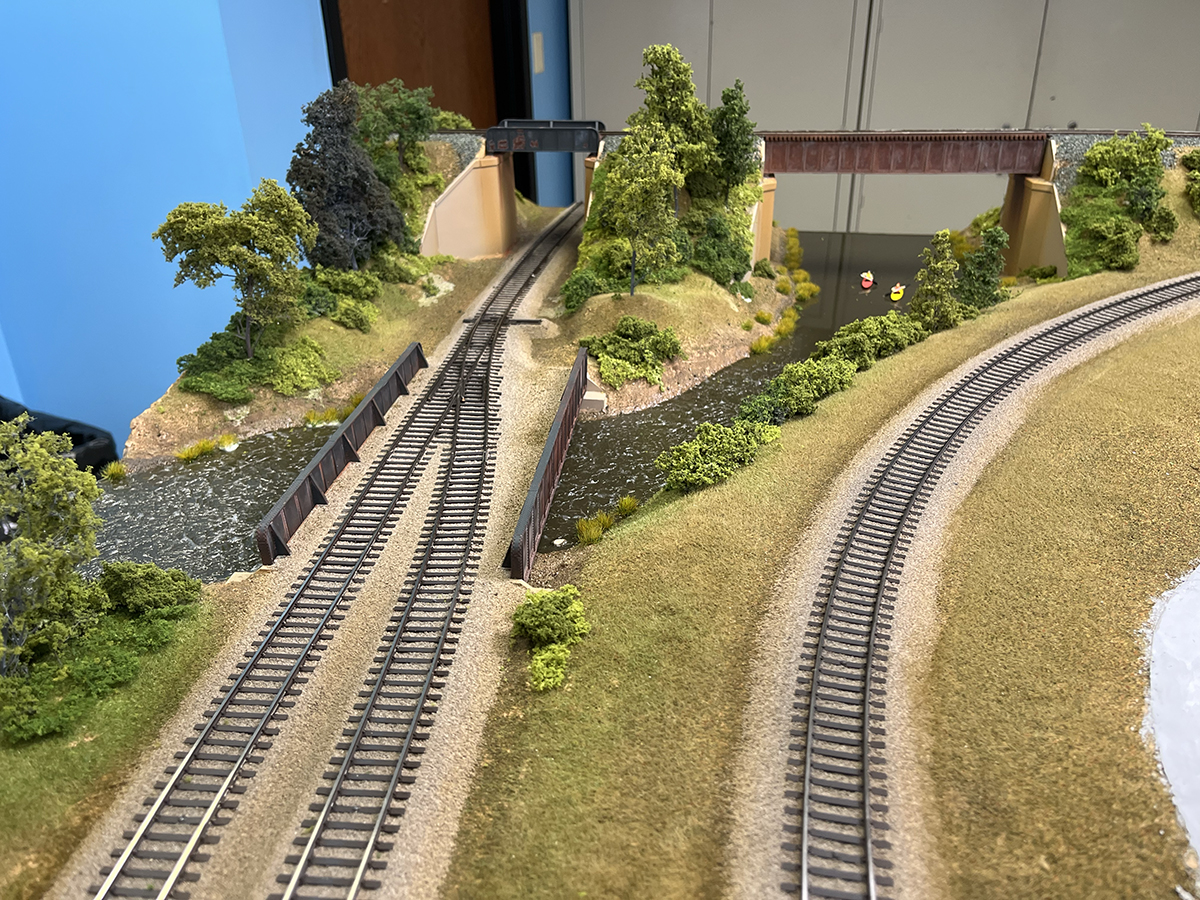 A scenicked model railroad layout with multiple rail lines and a river demonstrating the value of painting and ballasting track
