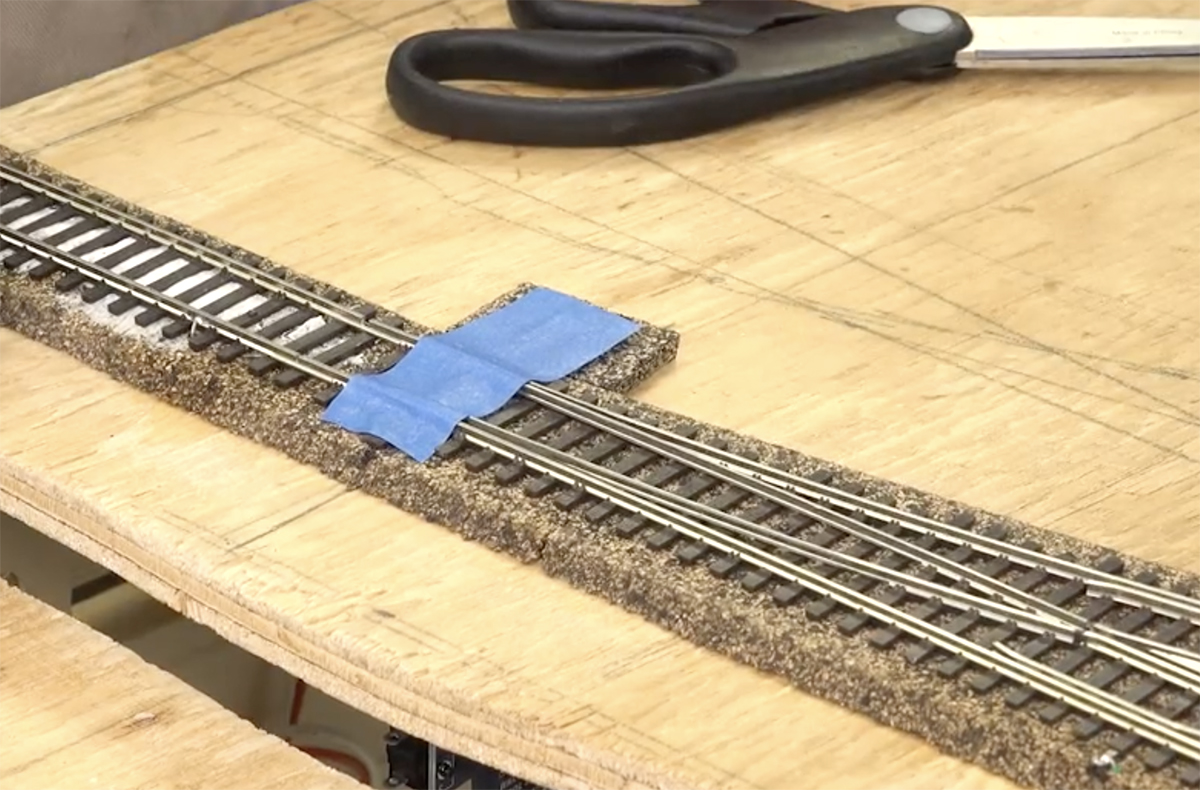 model rail turnouts taped over with blue painter's tape