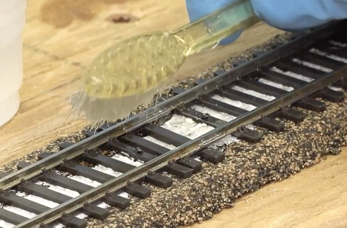 Cody applied the material in several steps, starting with placing ballast in between the rails and being careful to remove it from the tops of the ties and keep it out of the moving parts of the turnouts. After soaking that with Woodland Scenics’ Scenic Cement, he then applied ballast to the shoulders of the right-of-way in two applications. For the first, he painted on full-strength white glue, then sprinkled a light coat of ballast into it. Once the glue dried, he applied more ballast to the shoulders and shaped them with a foam brush. He then soaked all of the ballast with 70% isopropyl rubbing alcohol and applied a final application of Scenic Cement. The alcohol acts as a wetting agent, allowing the cement to penetrate the granules without beading up.