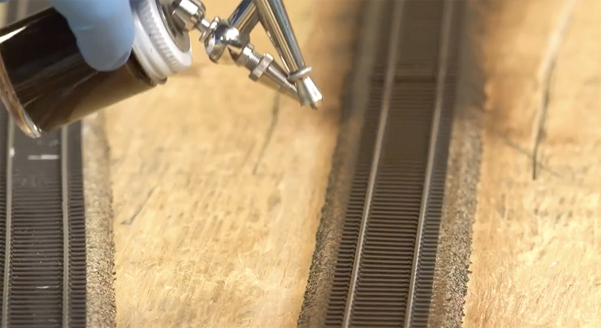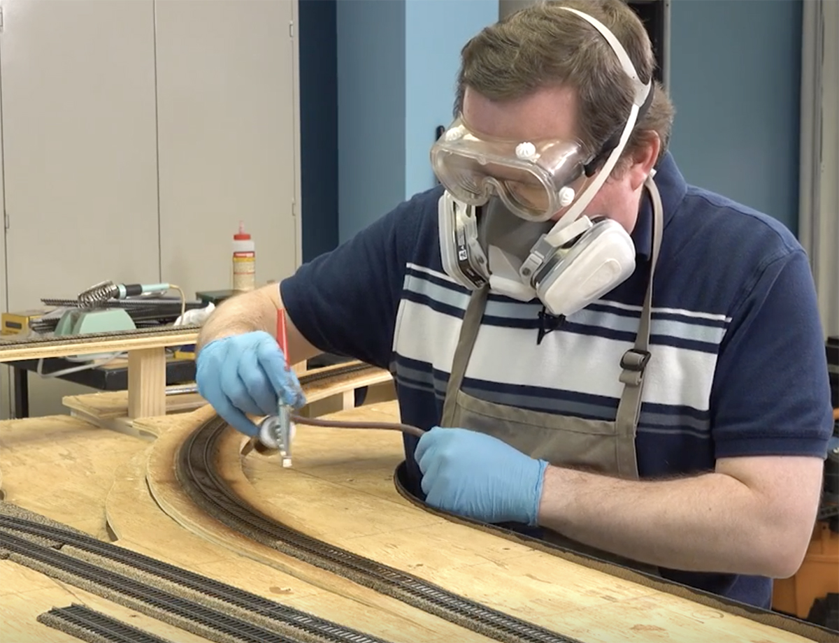 Cody applied the paint to the rails and ties with an airbrush. While airbrushing models in a spray booth is a fairly safe activity, take extra precautions when airbrushing track or scenery on your model railroad. Make sure the room is well-ventilated. We had fans to move the air and particulate through the shop and out of the building. Also be sure to wear a respirator with filters made specifically for paint work, as well as full goggles to protect your eyes. Particulates can stay suspended in the air for some time, so be sure to let the room completely clear before removing your protective gear.