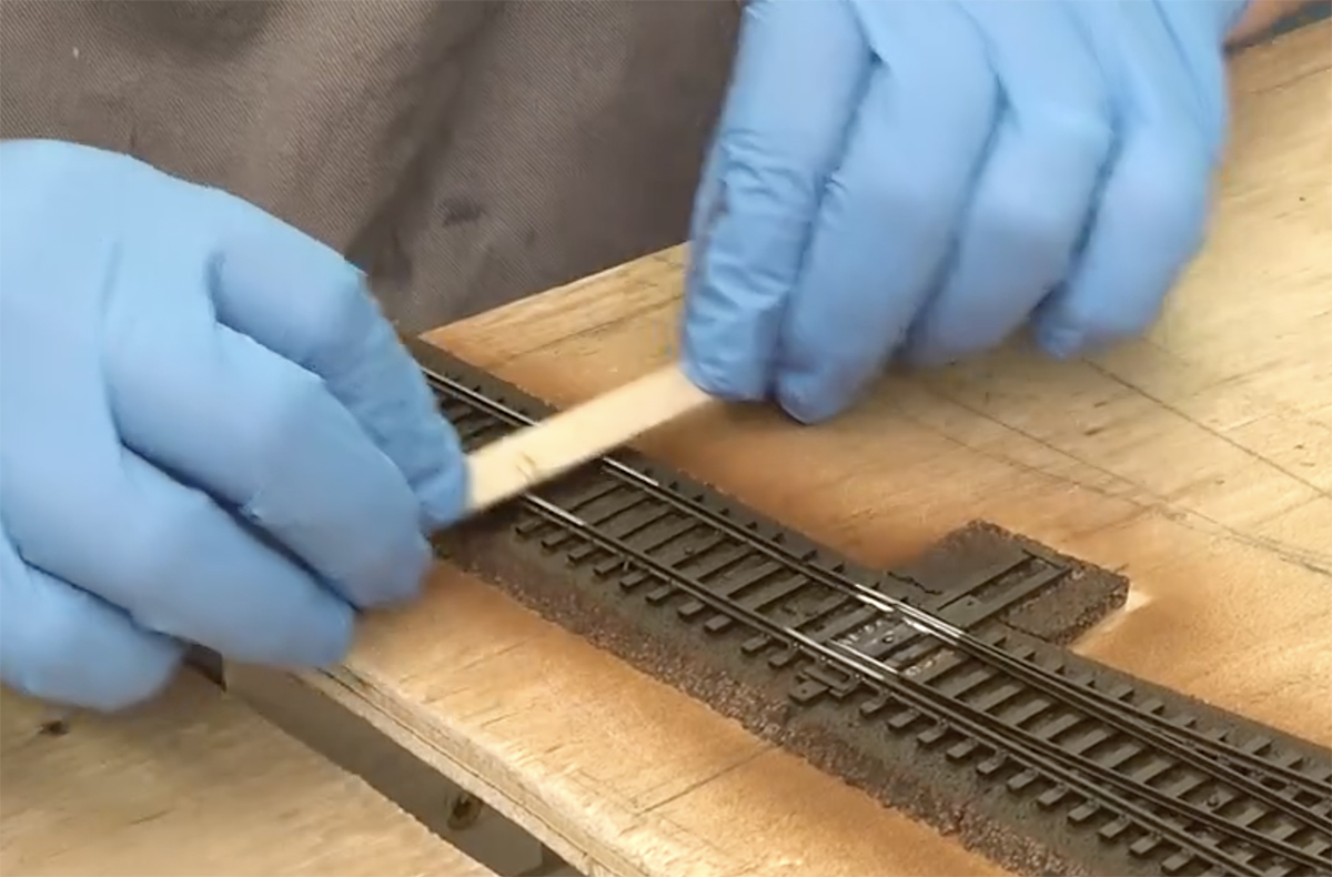 A tooth brush is used on model railroad track