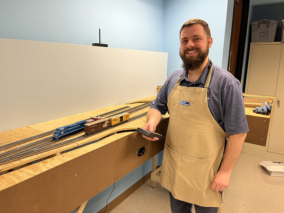 MR associate editor Bryson Sleppy takes some time out from the weeks of construction work to enjoy running a train on the East Troy HO scale Project railroad. Rest assure, this break is only temporary, as there are a lot more project to come on the model railroad. Model Railroader staff photos