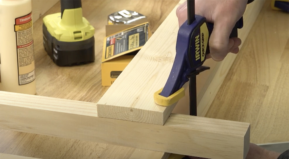 After cutting the parts for a pair of legs, we glued and clamped the 1 x 4 crossmember 4” from the bottom and flush at the outer edge of both legs. We then used a square to make sure the parts were aligned, and we doublechecked the measurement at the top of the legs for proper spacing. We then drilled the pieces and installed 1-5/8” deck screws.