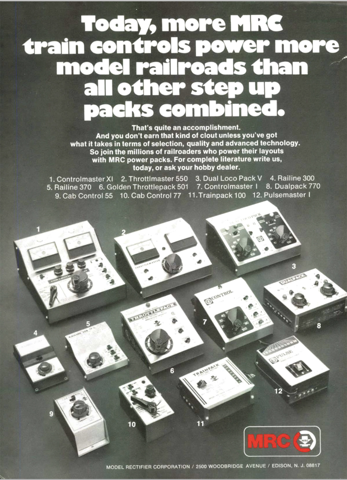 Vintage full-spread magazine ad featuring red and white text on a black background, as well as many photos of black, white, and silver model train electronic boxes with various switches, dials, and lights.