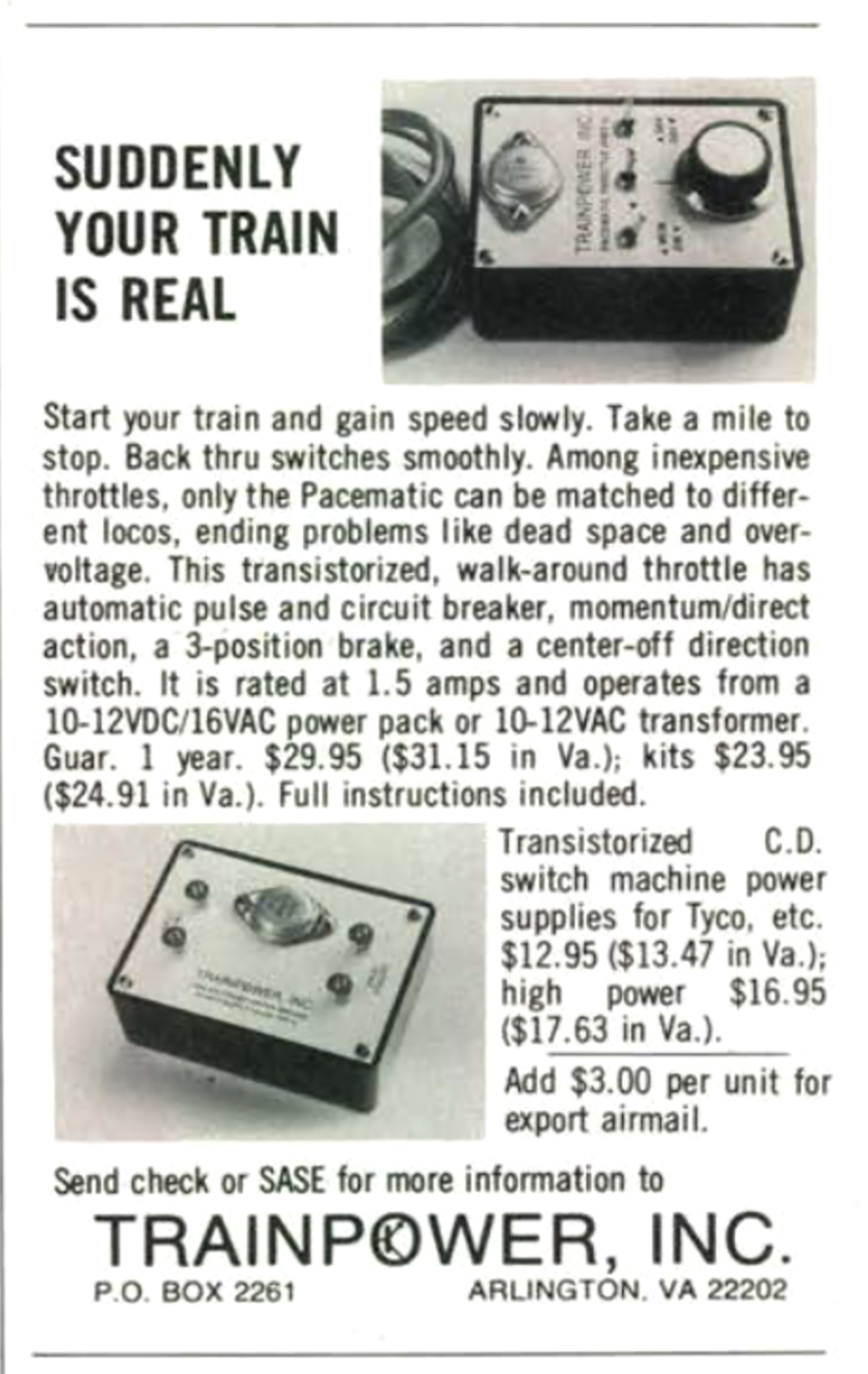 On page 141 was a small add for TrainPower, Inc.’s Pacematic walk-around transistorized throttle, featuring automatic pulse power, momentum, and a three-position brake. This was designed to be the controller for a standard 10-12 volt transformer. You could buy it assembled or as a kit. It was tethered to the layout, but you could make that cable as long as you wished.