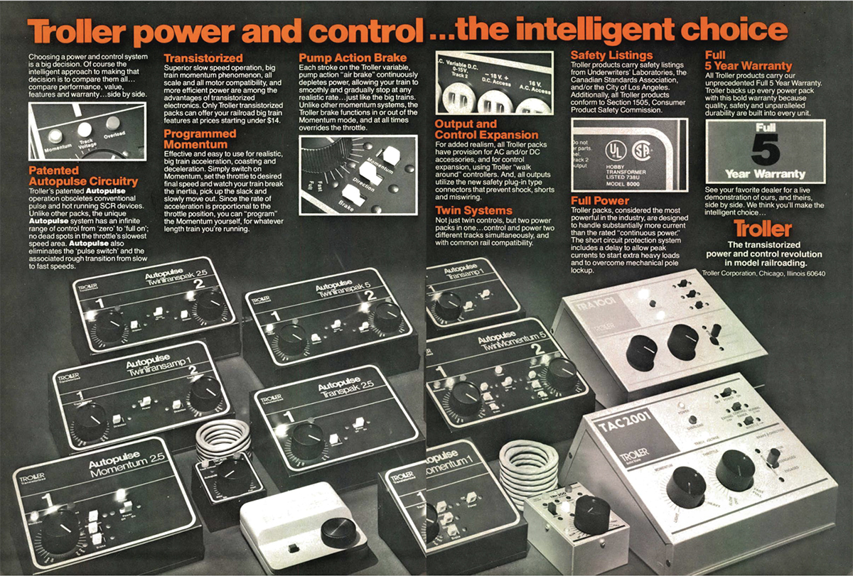 While I’ve written on this subject before from its appearance in the 1960s, the desire to follow your train around the layout continued to grip the hobby in 1980, and assorted manufacturers, including TrainPower, MRC, Troller, and others produced an assortment of walk-around cab options for analog control. (As we’ll see at a couple of points bit later in the issue, command control was making big inroads at this time as well.)
