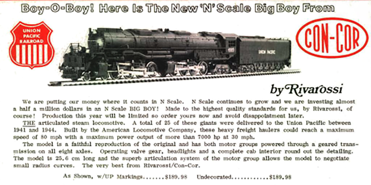 In 1980, Con-Cor and Rivarossi teamed up to bring the world its first plastic model of a 4-8-8-4 Big Boy in N scale.