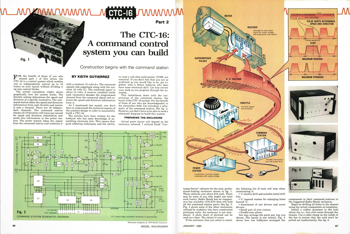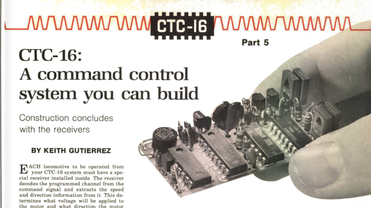 First featured in the December 1979 MR, CTC-16 was an early command control system designed and built by Keith Gutierrez utilizing most of the components of modern DCC users are familiar with, including the command station, power supply, cabs, and locomotive decoders. Like DCC, CTC-16 sends command signals through the electrical power supplied to the rails, allowing decoder-equipped locomotives to operate on the same track without separate electrical blocks. The system could operate up to 16 cabs and decoder-equipped locomotives at a time. In the version describe in his 1980s article series, operation was basic, including forward, reverse, and variable speed control.