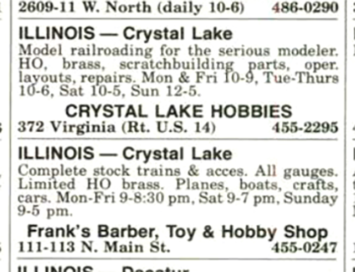 As shown in the inset photo, my two local stores are listed as well: Frank’s Toy and Barber Shop and Crystal Lake Hobbies. Crystal Lake Hobbies was run by Dave and Maggie Methlie. The strip mall store-front shop had a large HO display layout depicting the Pennsy that Dave used for modeling classes in the evenings. (See “Dave Methlie’s school for model railroaders” on page 106 of the March 1980 issue – it includes a track plan for the layout.) My dad and I learned how to apply ballast at one of them. Dave also built custom layouts for people, and he was hired by MR in 2005 to build the Stoney Creek 4 x 8 HO layout and write the project series that began in the January 2006 issue.