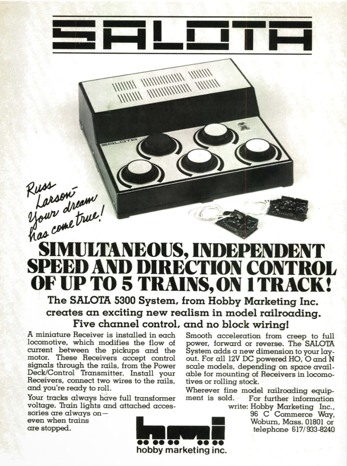 While the Ad doesn’t mention G scale at all, from doing some web searching, it appears that LGB Trains made a reference to the SALOTA system in its 1979 catalog as suitable for its 1:23.5 models. If that is the case, the large receivers would work well in that scale. To further support this theory, the ad in MR shown here has the penned inscription, “Russ Larson – Your dream has come true!” Being that the former MR editor and publisher was heavily into large scale trains, it seems to bear out the idea that the SALOTA system was intended for something bigger than N scale.