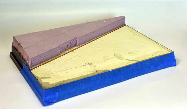 After cutting the bulkhead wall to length, including cutting the ends at an angle to match the shape of the clear plastic slot car box cover, I realized I’d need to pour a big chunk of anchor cement, so I dug into my stash of extruded-foam insulation board for a filler piece to go behind the bulkhead. I also realized the warehouse wall was going to need something behind it. It would have been fun to create an interior scene, but I was on a deadline to complete the project, and I wanted the tugboat to be the star of the scene, so I carved another chunk of foam to go behind the wall and support it.