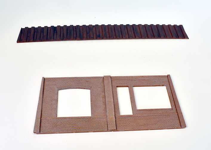 With all of the main elements worked out, I finished the wall section, painting and weathering them with a mixture of spray paint and various washes to create mortar lines in the brick wall, and dirt and grime on the white-painted doors and window.