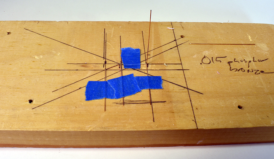 I used phosphor bronze wire soldered together to create a railing for the stairs, and also to make a sign bracket for a sign I placed over the door, identifying the warehouse as L&L Worldwide, using my parents’ initials and referencing their enjoyment of travel.