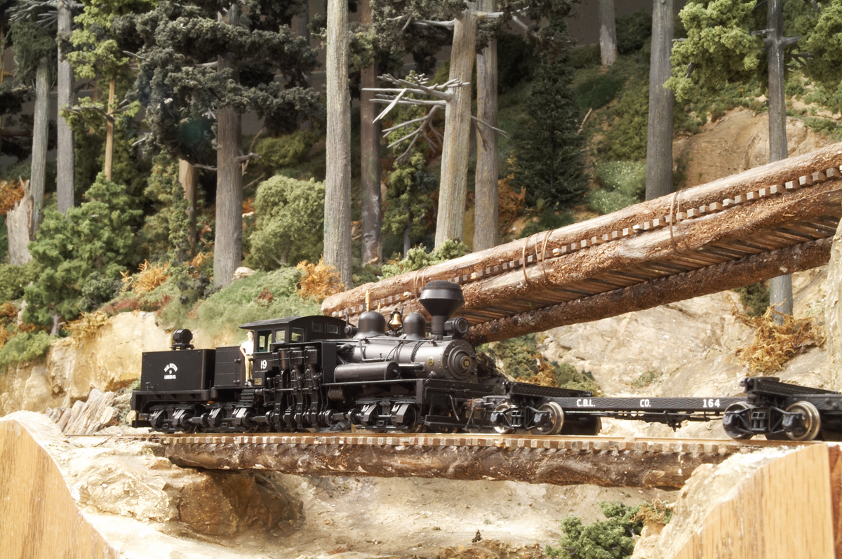 The Fruit Growers Supply RR is just one of the 10 railroads featured on Bruce’s layout. The logging line is located on the top layout deck. It’s suspended from the ceiling using steel rods, which are hidden in the trees.