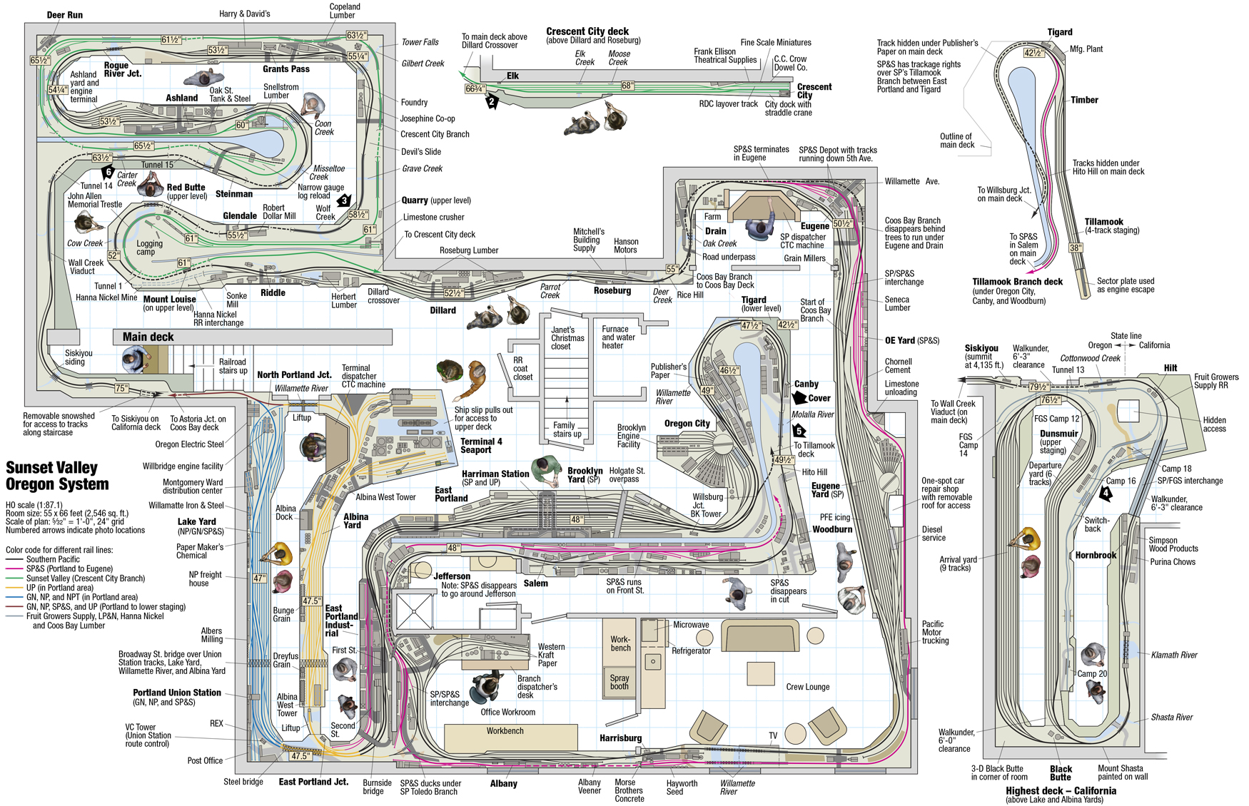 A track plan for the Sunset Valley Oregon System, a large model railroad layout