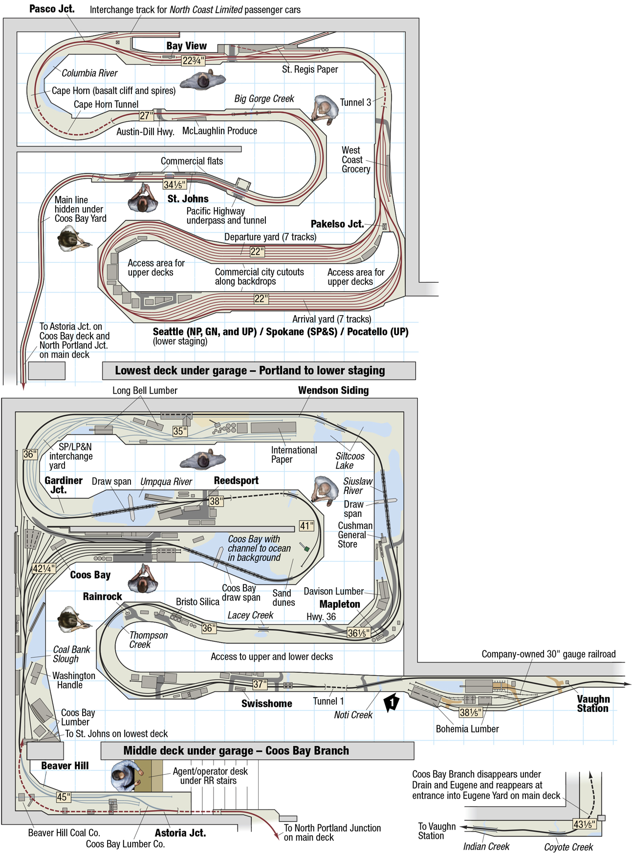 To better understand the layout, let’s take a trip over the Sunset Valley Oregon System’s main line, starting from the lowest-level staging yard and traveling to the highest level at Dunsmuir.