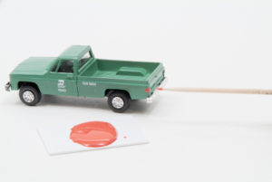 A silver felt tip marker is held near the rear of a green HO scale pick-up truck on which the marker colored taillights.