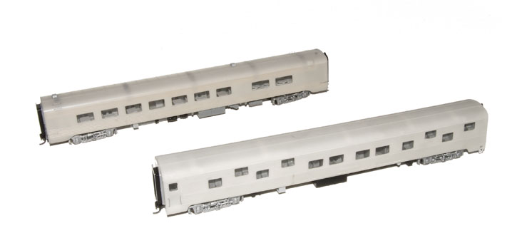 Osgood-Bradley chair cars. Southern Pacific (two-tone gray circa 1954-59 and simulated stainless steel circa 1960, both without skirting) and St. Louis Southwestern (Daylight scheme circa 1949-53 and Dark Olive circa 1940-48, both with skirts). Factory-painted and lettered brass models with detailed interiors. Price to be announced. The Coach Yard, www.thecoachyard.com