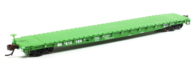68-foot flatcar. New paint schemes: Atchison, Topeka & Santa Fe; BNSF Ry.; TTX (short bulkhead); and Union Pacific (maintenance-of-way). Side stake pockets, simulated tie loops, and fish-belly center sill. $52.95. Ready-to-run. Trainman line. Atlas O, 908-687-0880, www.atlaso.com