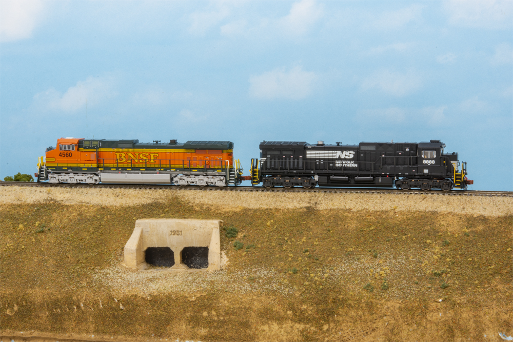 General Electric Dash 9-44CW and Dash 9-40C diesel locomotives. Dash 9-44CW: BNSF (Heritage II with Heritage I replacement hood section in two road numbers and Heritage II scheme). Dash 9-40C: Norfolk Southern (as-delivered scheme). Six numbers per scheme unless noted. Directional light-emitting-diode headlights, all-wheel drive and electrical pickup, and 5,000-gallon fuel tank. Direct-current model with Next18 connector, $139.99; with dual-mode ESU LokSound 5 sound decoder and dual cube-type speakers, $234.99. Rivet Counter line. ScaleTrains.com Inc., 423-299-3689, scaletrains.com