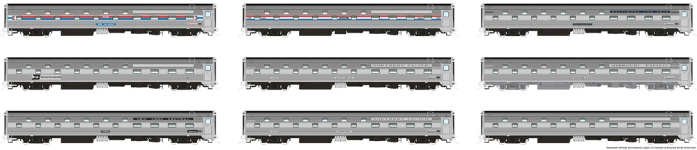 Budd Slumbercoach. Amtrak (Phase 1 and 3 schemes [latter with as-built underbody configuration]); Baltimore & Ohio (five road numbers); Burlington Northern (two numbers); Chicago, Burlington & Quincy (Northern Pacific scheme with CB&Q sublettering, two numbers); Missouri Pacific (one number); New York Central; and Northern Pacific. Four numbers per scheme unless noted; also available painted stainless steel but unlettered. Underbody detail with separate pipes and conduits, multi-color interior detail including roomette doors, Accurate GSC 41-NDO-11 trucks with disc brake detail, etched-metal end gates, and sprung diaphragms. $119.95. Release date to be announced. Rapido Trains, 905-474-3314, rapidotrains.com