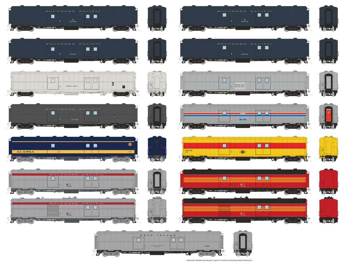 Road names: Southern Pacific (baggage/messenger and baggage/express with early and late doors, lease, maintenance of way, and scale test car), Amtrak, Alaska RR (with sound), Eureka Southern, and Rock Island. One to three road numbers per scheme. Southern Pacific business train two-car sets (economy baggage car and power car with sound) in two paint schemes.
