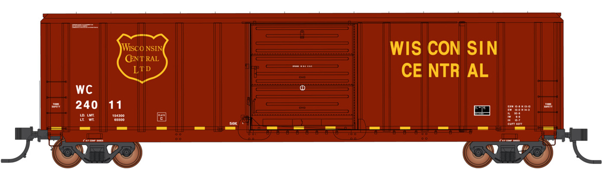 Road names: Prototype schemes — Wisconsin Central, Railbox (patched with faded graphics and as-delivered scheme), Canadian Pacific Ry., Chicago & North Western, Golden Triangle RR, Pickens RR, St. Lawrence RR, and St. Marys RR. Famous image (fictional) schemes — Camas Prairie RR Co.; Colorado Midland; New York, Ontario & Western; and Tonopah & Tidewater. Three to six road numbers per scheme.