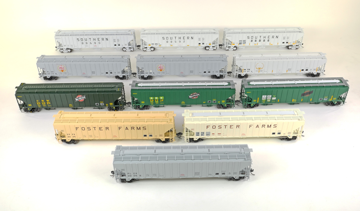 Road names: Arkansas & Oklahoma (2006+ ex-C&NW restencil, three numbers), Caney Fork & Western (2021+ ex-C&NW restencil, three numbers), Chicago & North Western (March 1981 delivery green, 24 numbers), Foster Farms (1980 delivery, four numbers), Interstate Commodities (2011+ ex-Foster Farms and 2015+ ex-Producer’s Grain, one number each); Pullman Leasing Co. (April 1980 gray lease scheme and 1980 Producer’s Grain, six numbers each), Soo Line (1985+ ex-Producer’s Grain, two numbers), Southern Ry. (1981 delivery gray in 12 numbers and 1981 delivery gray with 2005+ yellow conspicuity stripes in six numbers), and Twin Cities & Western (2019+ ex-Southern Ry., two road numbers). Also available ready-to-run but unpainted (1980 PLCX, 1981 C&NW, and 1981 Southern Ry. versions).