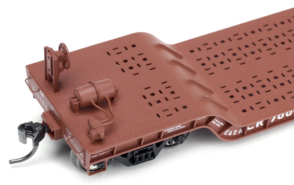The model has a well-detailed plastic body with a concealed die-cast metal weight. Its perforated, see-through GSI-style decks are bound to capture attention. An AB control valve and brake reservoir is mounted on the car’s raised deck at the B-end. All of the grab irons are formed wire.