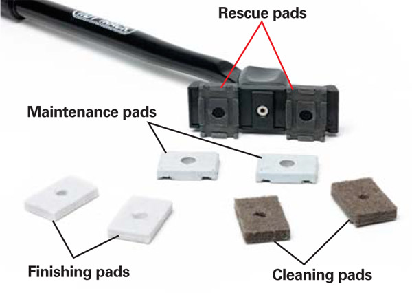 Two sets of hard rubber-like pads are included. One set is for regular cleaning. The other set, referred to as rescue pads, is slightly more abrasive and meant for removing heavy grime or rough spots. Both types of pads have grooves that fit over the rails.