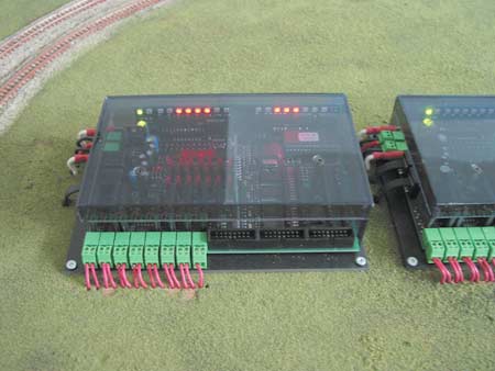 - Track section modules control 16 block outputs for detection and automatic speed regulation to match signal indications.