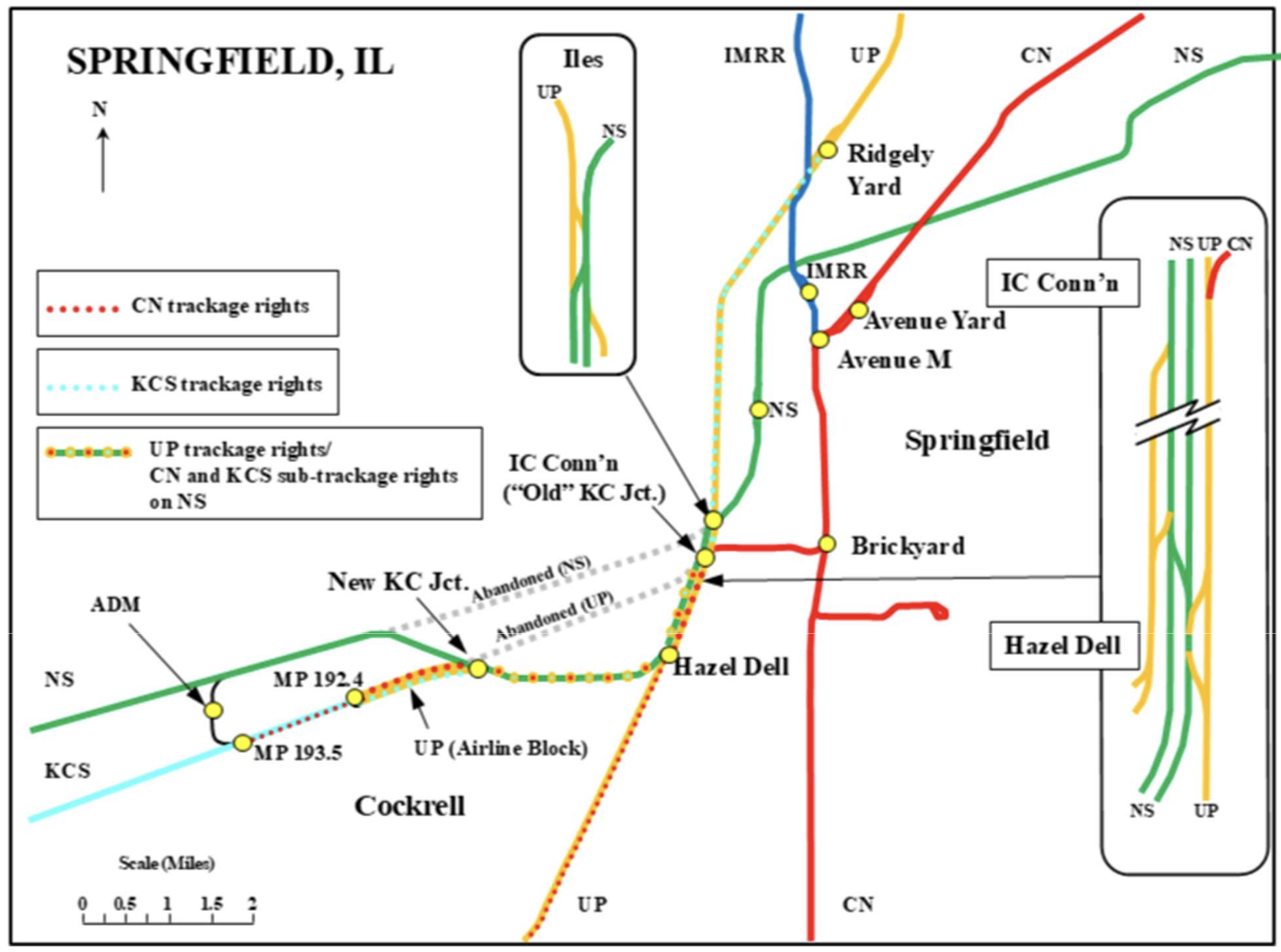 CN subsidiary Illinois Central maintained trackage rights in the Springfield area when in 1986 it sold its 631-mile line linking Joliet, Ill., with Kansas City, Mo., and East St. Louis, Ill., to Chicago, Missouri & Western, which is now part of UP.