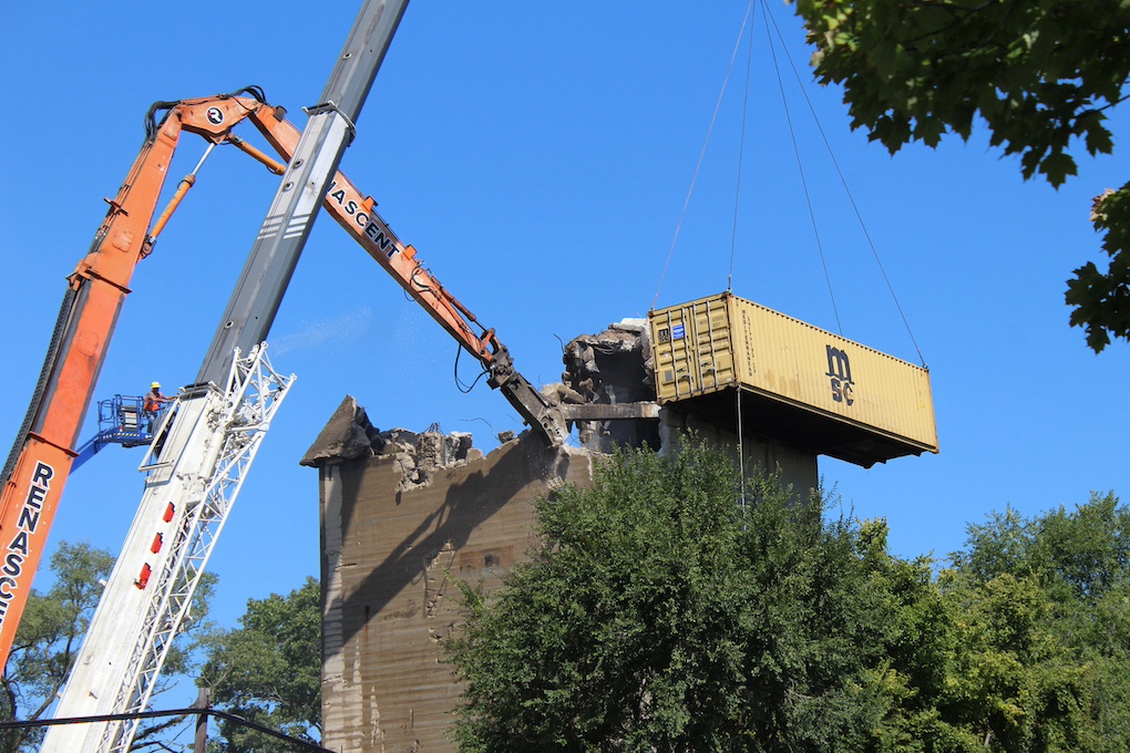 An empty shipping container is suspended by a third crane on the south side of the tower to prevent dust and chunks of concrete from falling on to nearby U.S. 12 and property adjacent to the highway. Bob Johnston