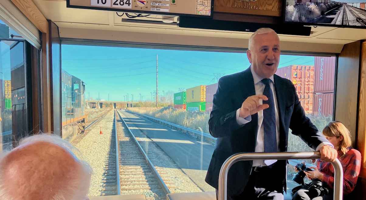 As the six-car train headed west at 10 mph on Wednesday — rolling between the Belt Railway of Chicago’s Clearing Yard to the north and CSX’s Bedford Park intermodal terminal to the south — UP CEO Jim Vena did not like what he was seeing from the Fox River theater car.