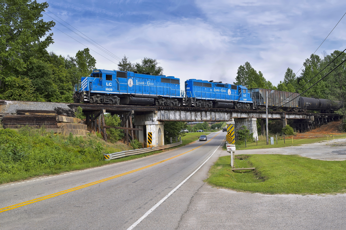Lancaster & Chester train 10, led by GP38-2 No. 2829, crosses over Highway 521 in Lancaster, S.C. on the SB-Line on May 11, 2017.