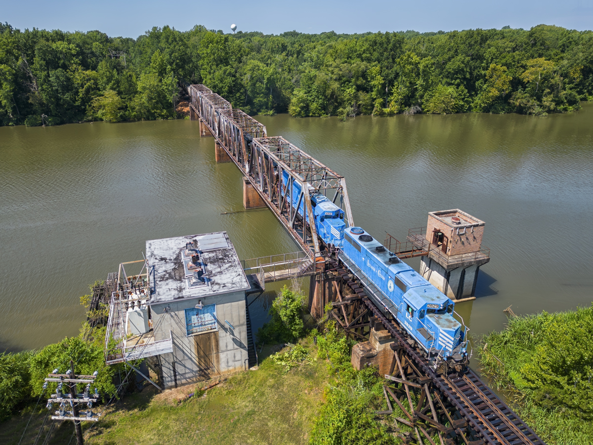 Lancaster & Chester train 14 led by No. 2829 crosses the Catawba River headed eastbound in Fort Lawn, S.C. on Aug. 15, 2023.
