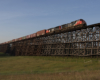 Westbound Canadian National train L515 crosses the Paddle River Trestle at Rochfort Bridge, Alberta. The 2,414-foot long, 110-foot high trestle is located on CN's Sangudo Sub, a 167-mile branch line running north west of Edmonton.